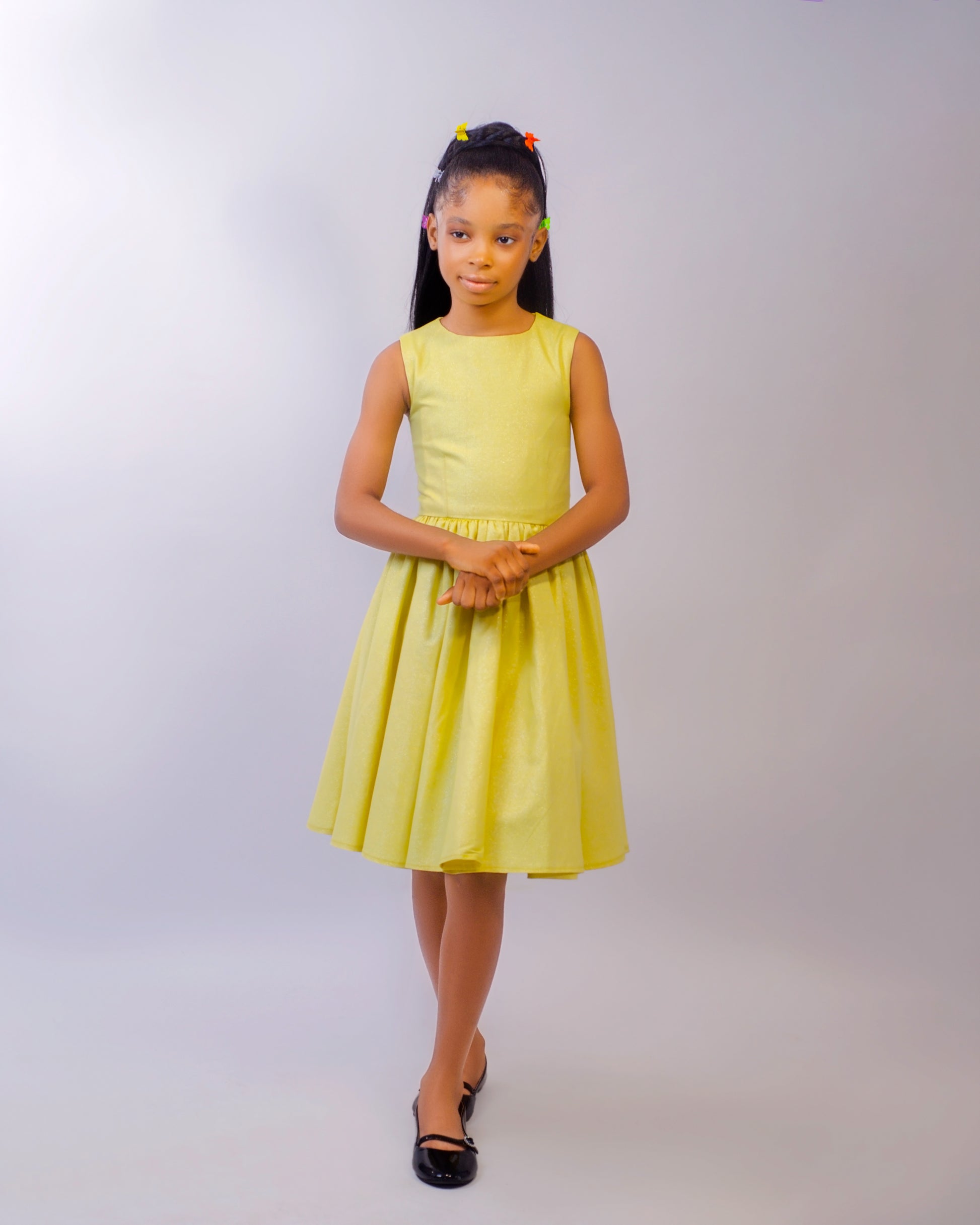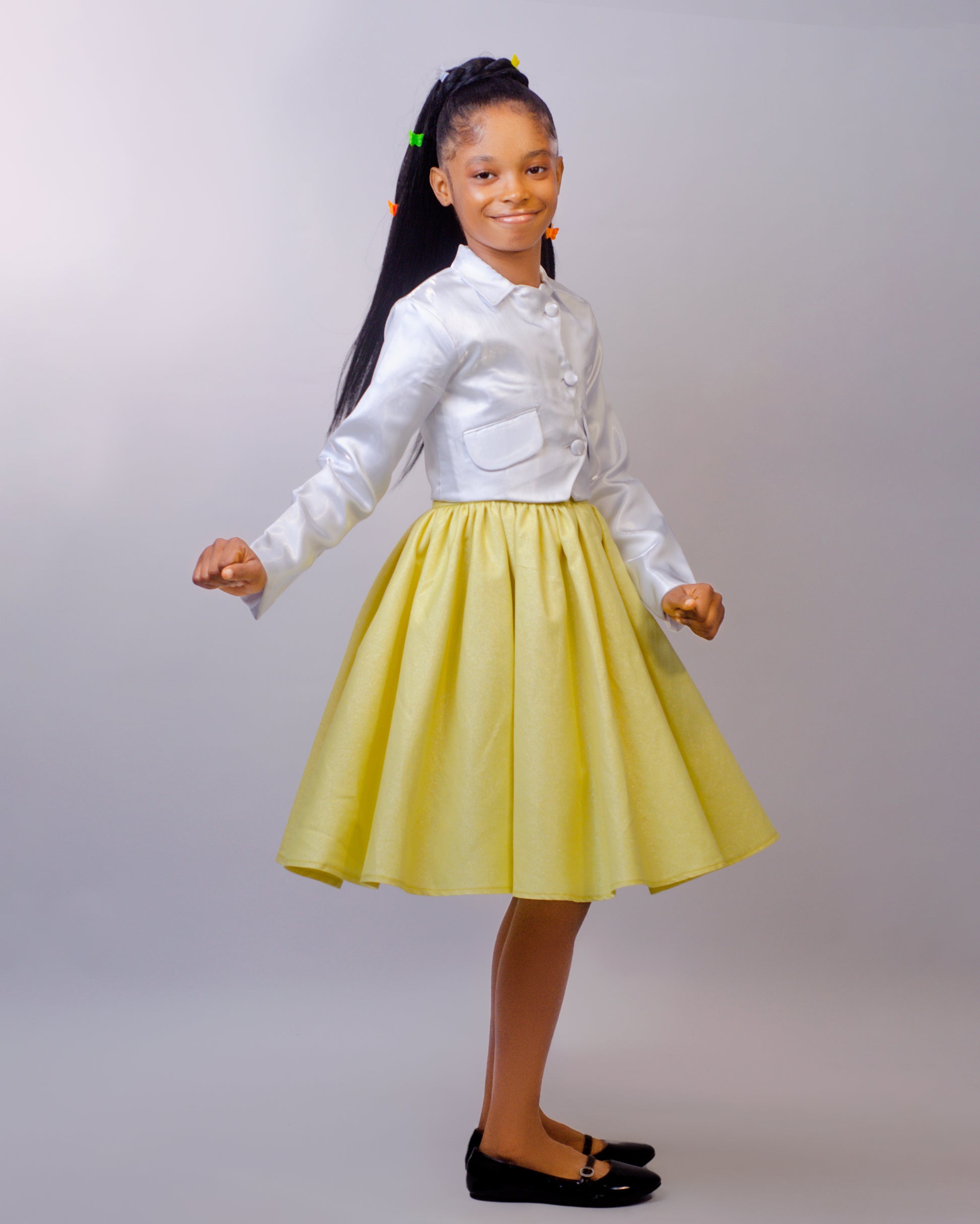 A luxurious two-piece ensemble featuring a flowing yellow gown with a gathered waist and soft volume, paired with a structured white mikado jacket. This refined look is perfect for formal portraits, graduations, family events, and elegant entrances.